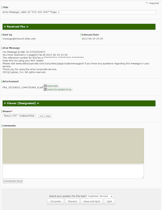 In this Business Process example, we use 'Internet Fax service (Online Fax)' such as "eFax". What is Internet Fax, is a service that delivering 'received faxes' to registered email address as digital file (attachment of PDF). Here in this model, 'the registered address' is set as 'the address for starting the Workflow'.