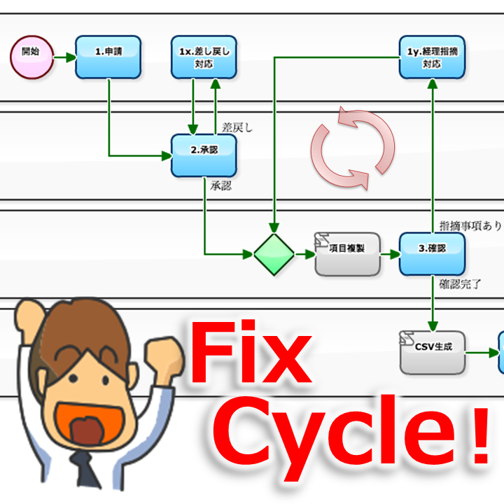 The most notable point is to let more than one person to report the "Construction progress in subjective". At the maximum of four people who are concerned in the project will make "Report" in this example of Business Process. However, as the flow of the business, it starts with the nomination of rapporteurs by the Accounting (or the Audit) department. Therefore, it can be said "Progress SURVEY process".